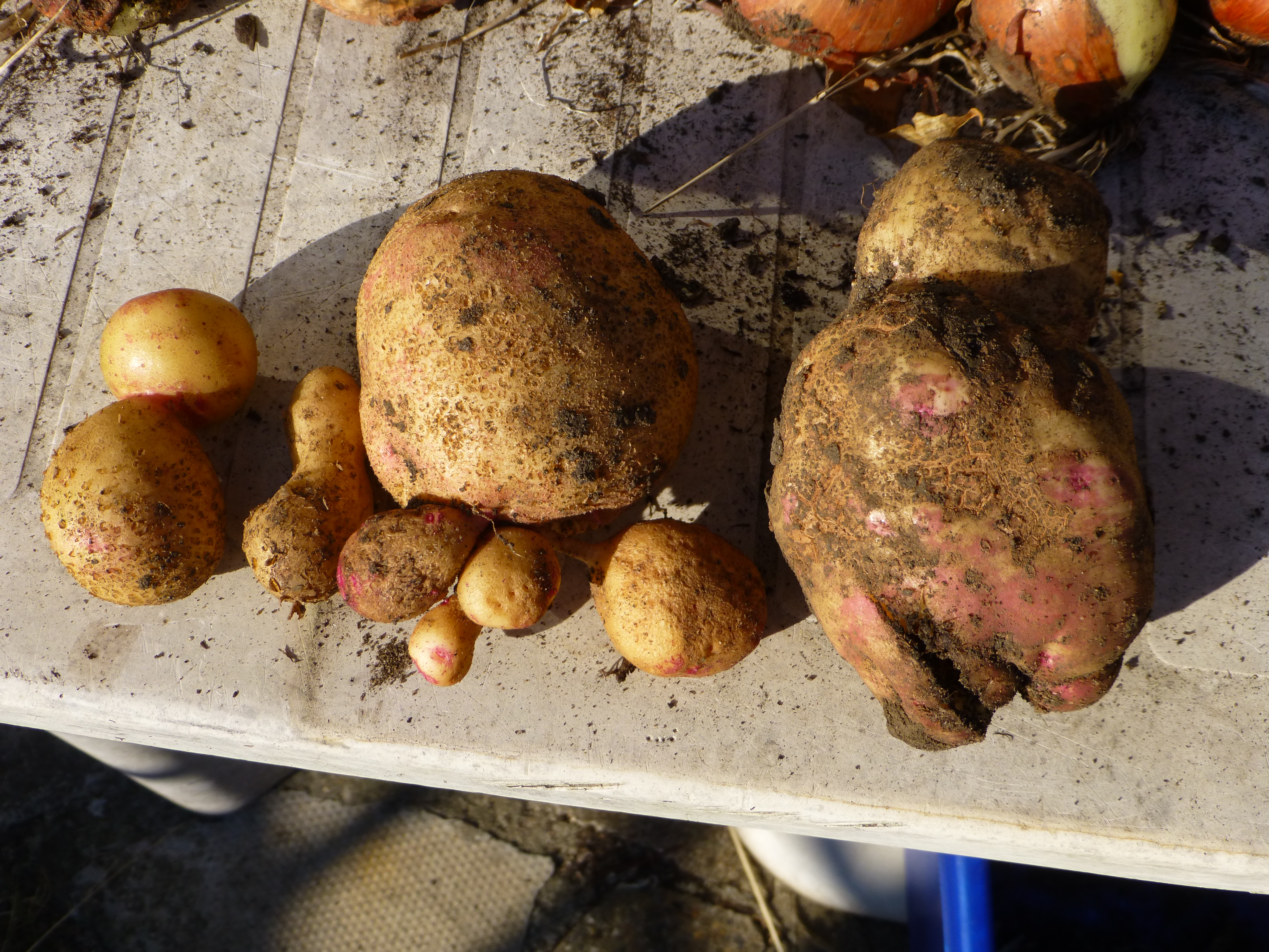 . So I decided to start with the onion bed. They’ve done really well this year, and I’ve got onions to last until at least Christmas if not longer. Some were really huge! I also found some rogue potatoes in the bed and dug then up also. I took some photos, which I hope you enjoy. Some of the potatoes were enormous, and some just plain weird. But then I never grow any normal veg, you should know that by now. I must have a bath before I got out tonight, and I’m a bit stinky!
