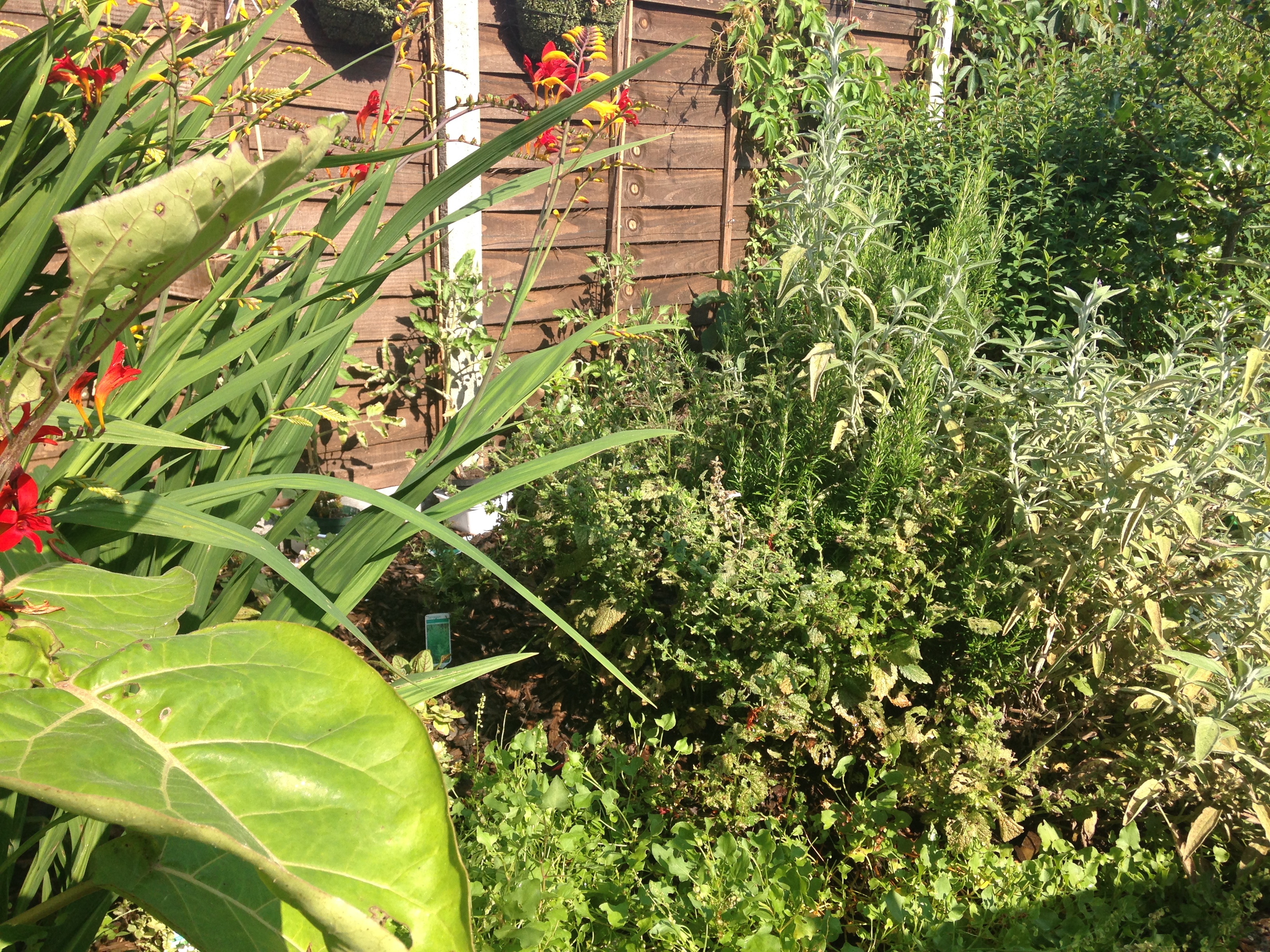 Then moving further on up the garden is my herb patch, which consists of a huge variety of herbs from Rosemary, Sage, Thyme, Marjoram, Bay and loads more. On the far left of the picture are some Crocosmia that I planted last year. They seem to love it there are the flowers are either deep red or yellow.