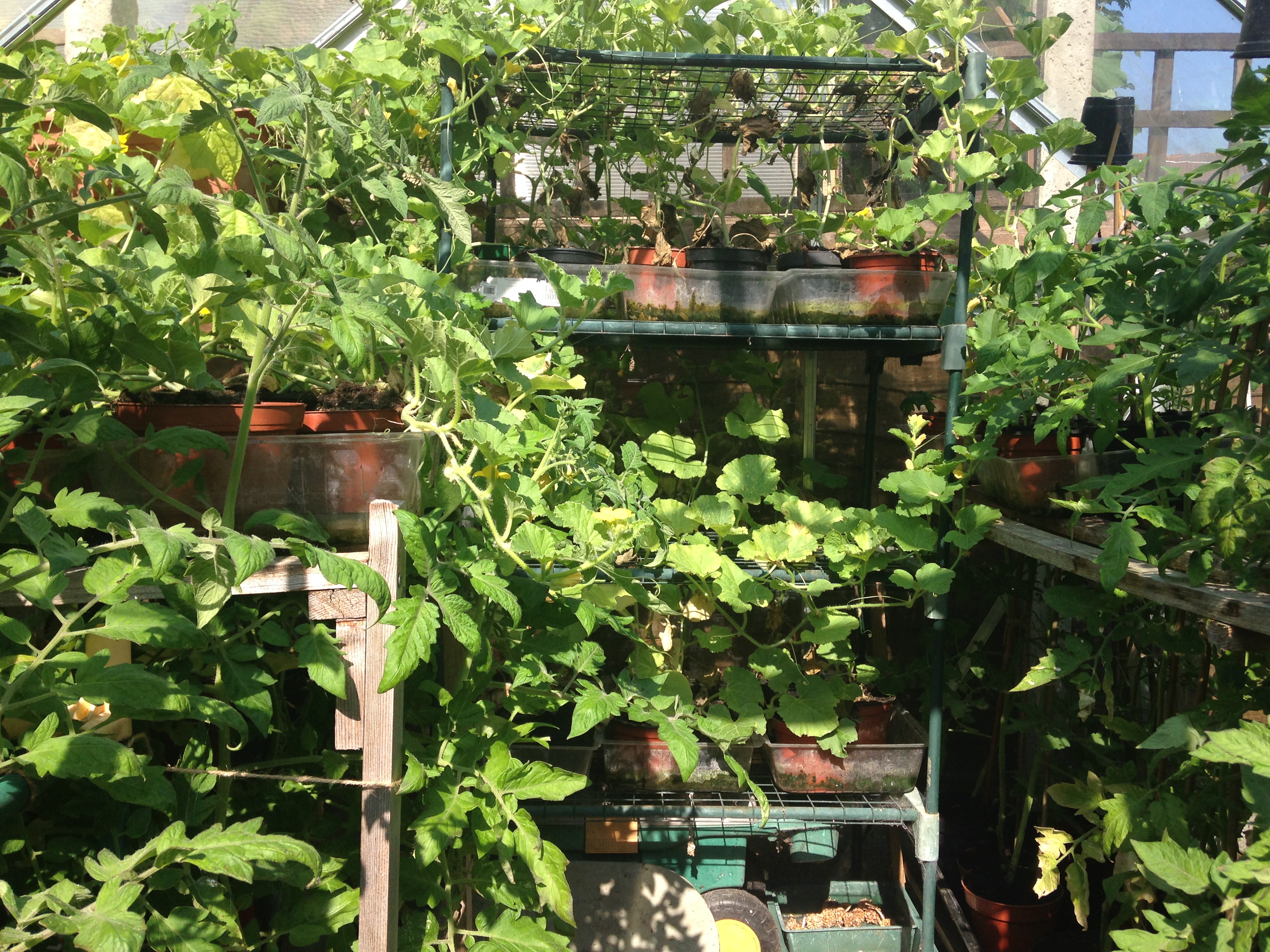 Then we come across the greenhouse where I had a bit of a tidy the other day so now it’s all beautiful and tidy. In here I’m growing Tomatoes, Sweet Peppers, Cucamelons and Melons. They all seem very happy and are growing really well. I know that it looks a bit like a mad house, but they seem to be all getting along.