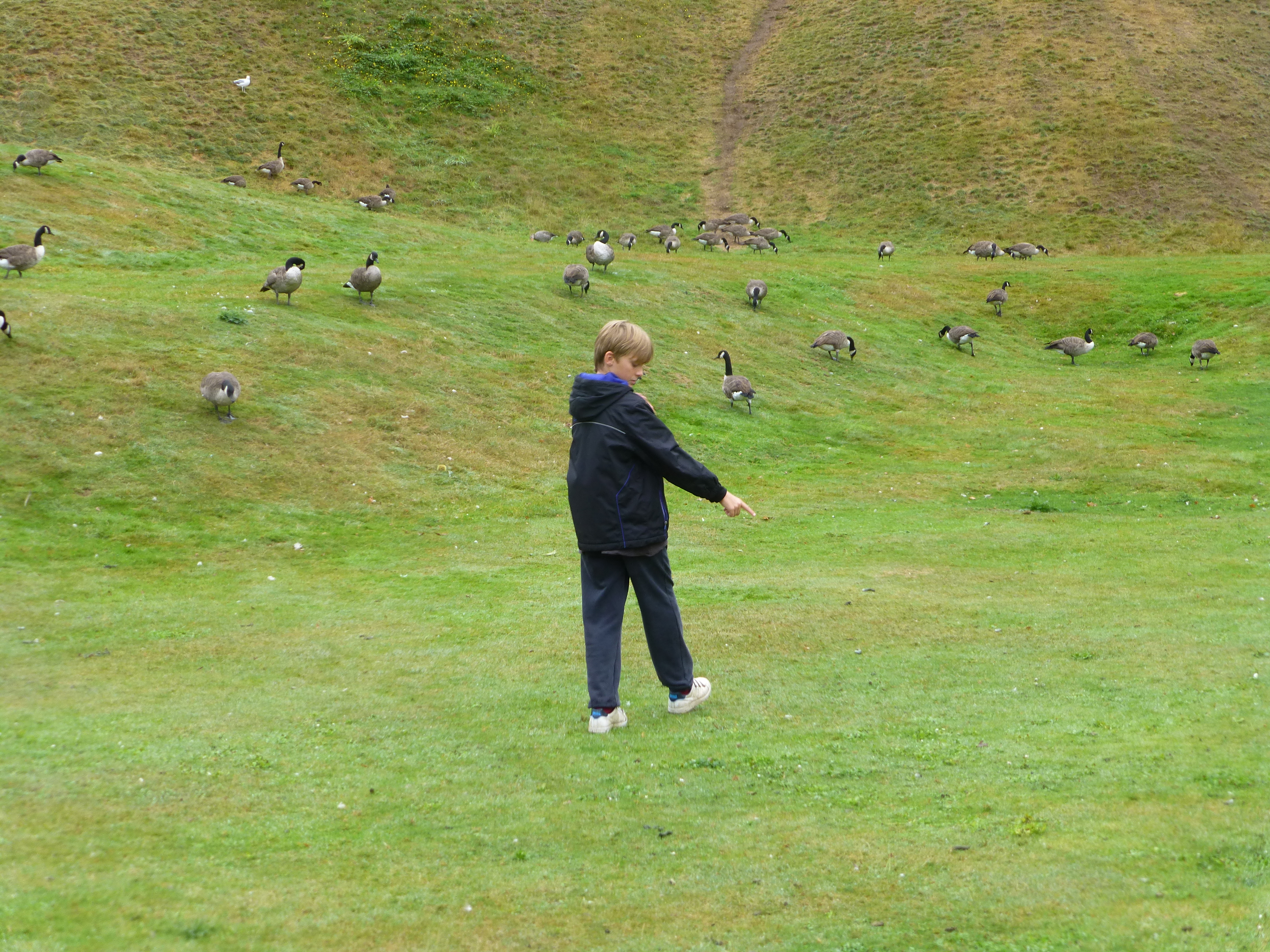 The summer holidays are very nearly over. George is back on Wednesday and Emily on the Thursday, so today I promised them that we would go out for a fun afternoon. I didn’t want to drive that far, and the weather was a bit drizzly at times, so we headed off to Claremont Landscape Gardens. It’s only about a 20 minute drive away, and no need to go on the M25 at any point, so it’s even better. We arrived about 2.30pm and had a leisurely wander round. Loads of the geese and ducks, that are usually in the pond, were out on the grass, and it looked a bit like a scene from the birds as they watched you as you walked past. George decided that he would try and herd some of them like sheep, but they weren’t impressed and kept quacking at him.