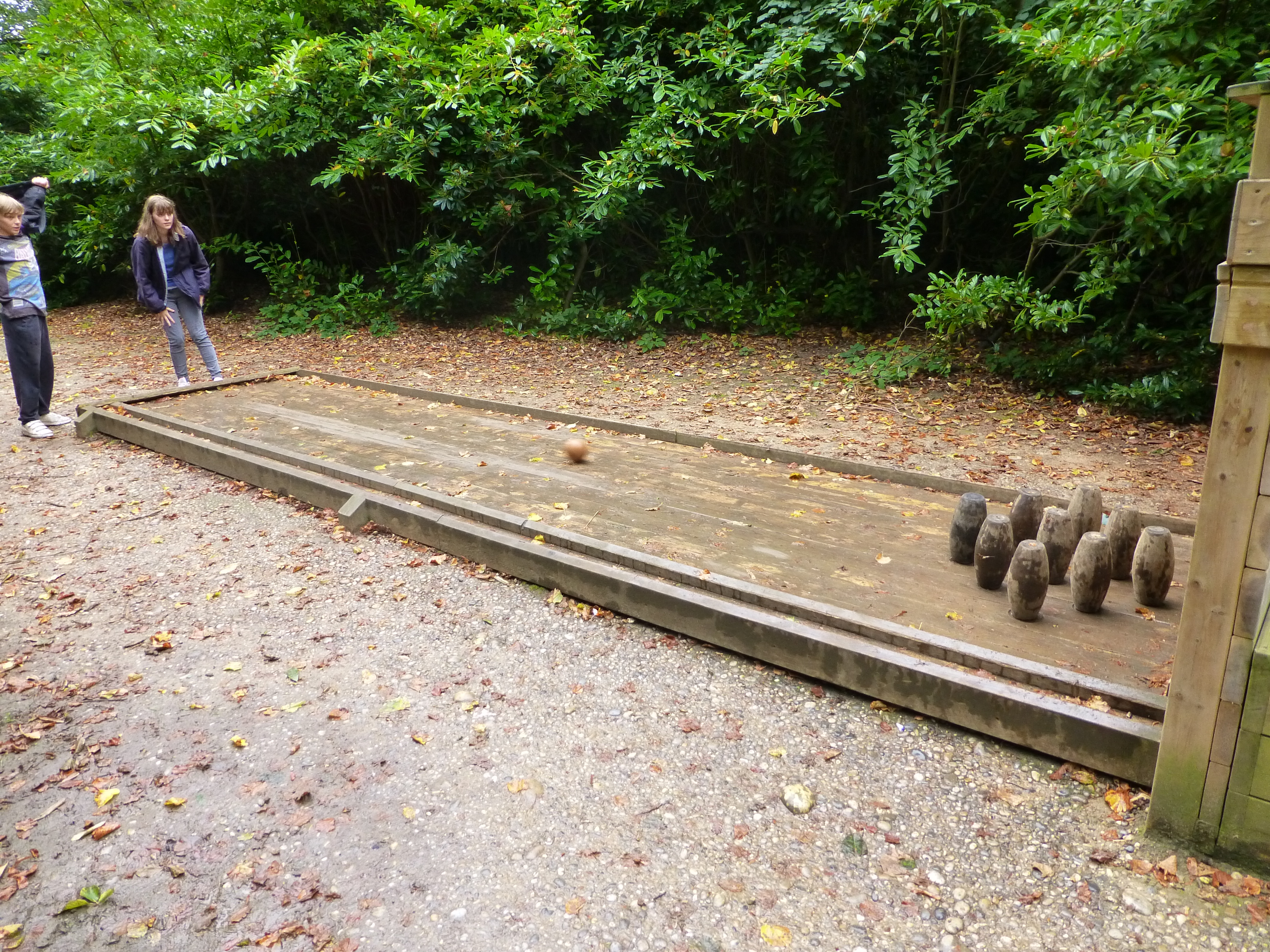 We walked round and round various paths, just taking a gentle stroll. The drizzle had stopped, but every time the trees moved, then water fell on us, so there was to be no sitting under a tree for a rest. They have an outdoor bowling game, and we all had a go, but the ball was rather dirty, so you didn’t want to hold it for that long.