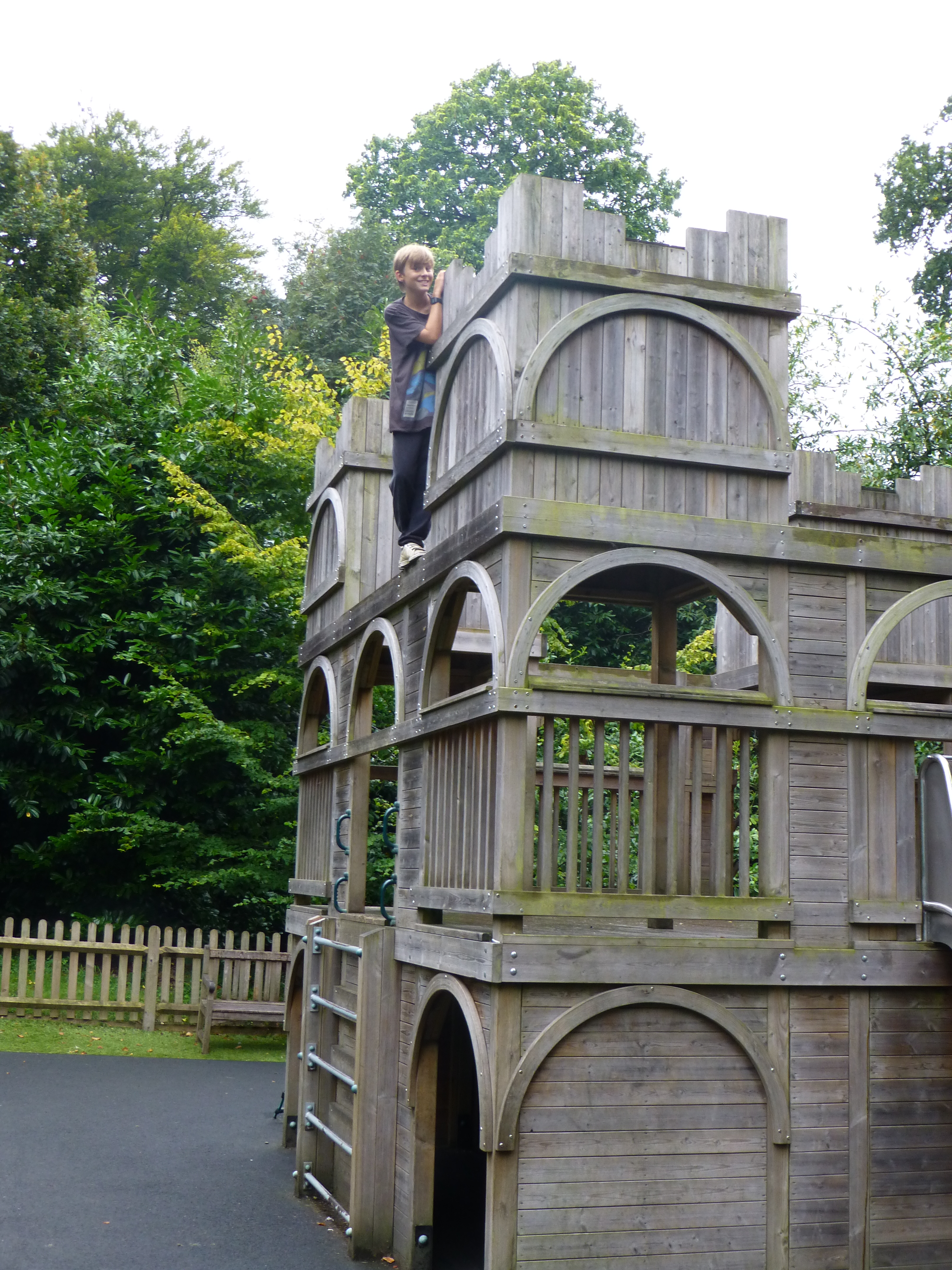 In the lake there were loads of fish swimming and a Heron was keeping guard. We didn’t see him fish for any, so maybe he wasn’t hungry at the time. But as we came to the end there is a play area for children 11 years and under. Now George is 12, but as there were hardly any baby children playing in the play area, I figured that it would be ok for him to have a go. Emily and I sat on some benches that were undercover and bet on how long it would take George to climb to the very top of the castle. Not long as it happened, I think it was the first thing he did. He was then joined shortly after by 2 other girls about his age, and they sat on a section each for ages and chatted. On the way down, one of the girls got stuck and then hurt her leg a bit (nothing but a bruise) George sat with her and chatted, til her granny came along (who we were actually sitting next to on the benches). I was told how wonderful George had been on talking to her to keep her happy. That’s my boy.