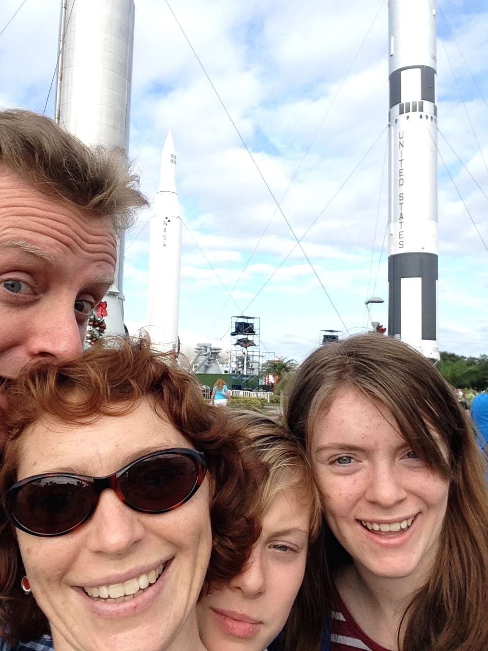 We saw so many different rockets, all to scale, so massive and huge. The lovely simple memorial of those astronauts who died during space missions. This was beautifully done, so simple and elegant. And if you were brave enough you can go in the Shuttle Launch Experience. If you’re not brave enough, then you can just watch. I was very apprehensive about this, but did pluck up enough courage to do it. Although I was slightly regretting this during the experience. But there was a timer on the wall, and I could watch the count down which helped me immensely. The ride lasts for 4 minutes, but seems much longer. You’re strapped in (which is never a good sign), and then tipped back so you’re lying on your back with your legs up. You then shake violently for several seconds, and then you blast off into space. The noise is phenomenal, and apparently like a real launch. After a couple more minutes of violent shaking the engines finally stop and you then very slowly tip forward. They open up the ceiling and you can see moving stars. Then slowly you tip back to normal, and that’s it!! I was told that is was like a rough plane decent, but I would question that. I’ve descended during a storm, and that was much calmer. Still I did it, but it was not in my comfort zone. Just before the end of the day we managed to squeeze in another family photo, this time with as many rockets behind us as we could. I’m not sure why Mark suddenly decided to grow a rocket out of his head, but hey ho.