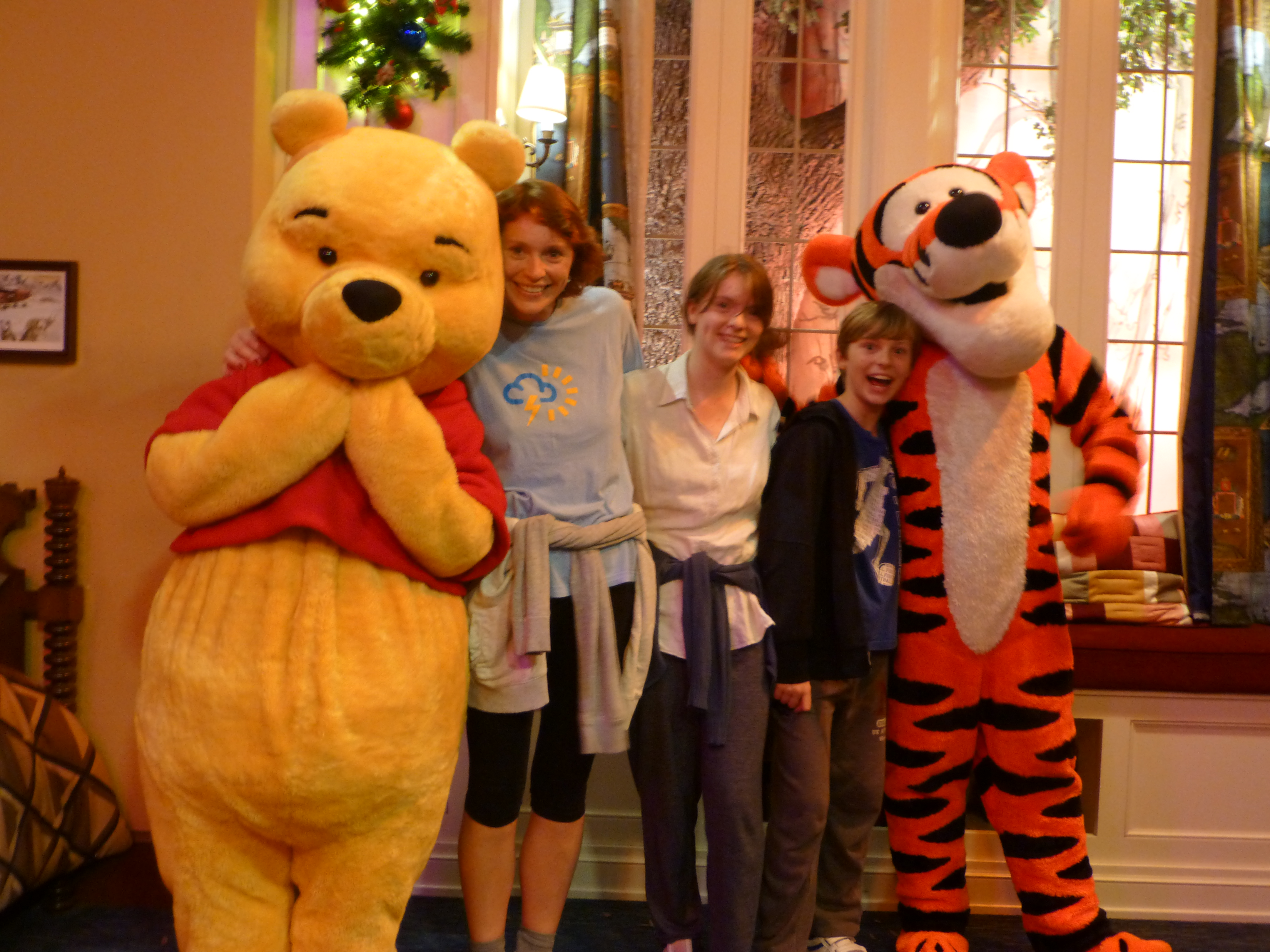 Oh, and we finally found some green apples for George. He loves Granny Smith apples, and has been 8 days without one. We found 3 and bought them all. As he ate his first one he was like a baby who’s just had a full bottle, very satisfied. Oh and he ate the other 2 apples a bit later on in the day. When we’d done all we wanted to, we got the boat back to Epcot and got Fish and Chips from the English area in the World Showcase, and sat by the lake to eat it. Before we caught the bus back to our hotel, we heard a band playing, so we went to investigate. They played some well know Rock and Roll numbers, and loads of people were dancing away. George went for a wander and came back saying Pooh and Tigger were about. So we went to see, and the kids and I had our photo taken with them both.