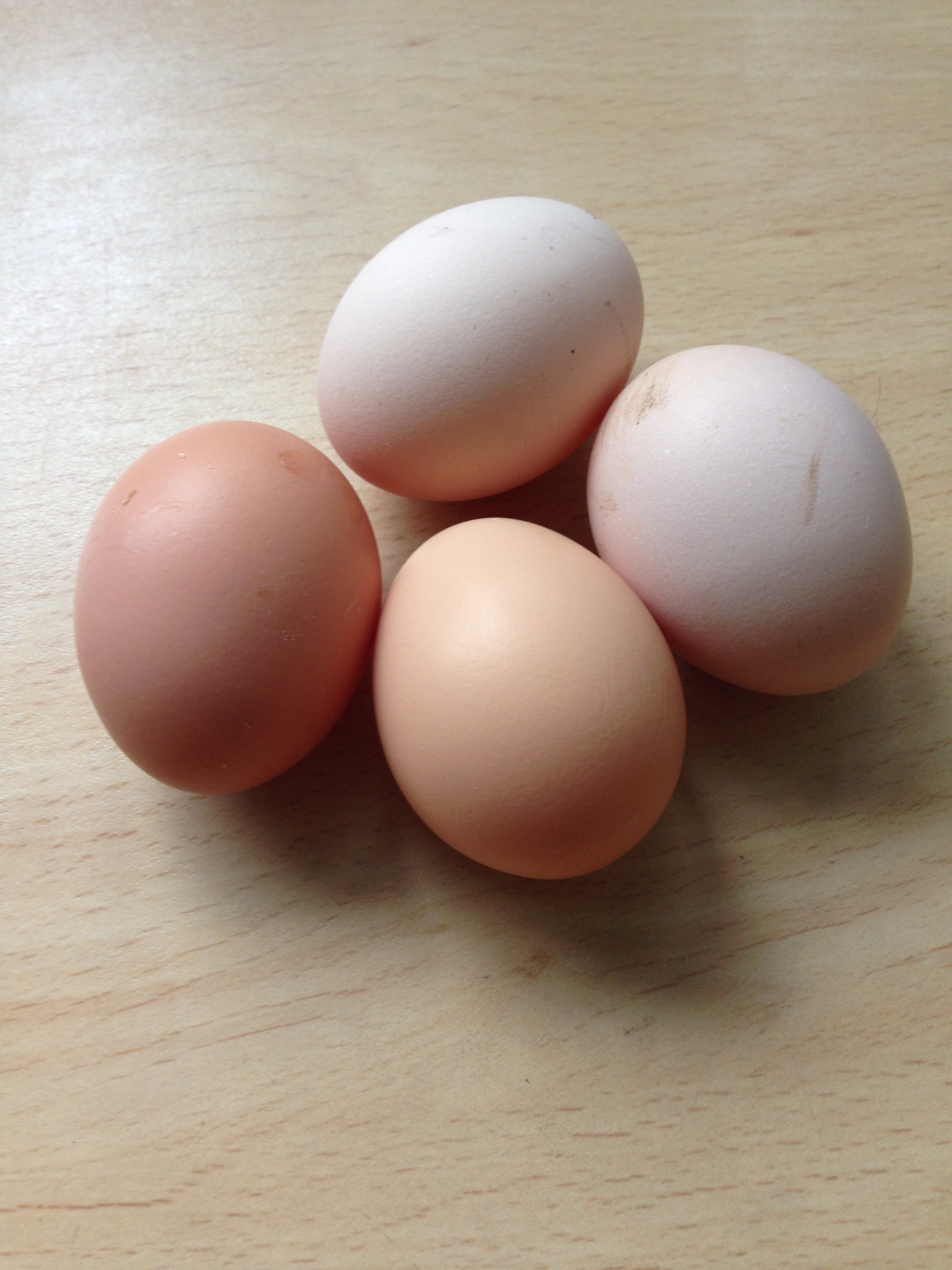 The weather wasn’t what I’d call “Spring like” today, but still it was dry, but NOT sunny. Still off I went, armed with my flask of tea to my allotment. I’ve managed to dig over more of the soft fruit bed, and then started to turn over another bed where the Onions were in last year, and I think I may plant some Potatoes in this year. We’ll see when I come to plant my potatoes out in about 3 – 4 weeks time. They’re still very happy chitting away on top of my kitchen cupboards. Getting back into the routine of some hard forking down the allotment takes a little while. At the moment, I can only dig for about an hour and a half before my back says “That’s enough for today”. Give it a couple of weeks and I’ll build up those muscles again and be able to manage much more hard forking. I also took home some treats for the chickens. Firstly some Sprouting Broccoli that is just about finished. I’ve hung that up in their run and they seem to like it. Also a mound of grass. Now I know this may sound a bit strange, but they love pecking the grass on my lawn, but they leave such a mess, so I decided to bring some home from the allotment for them, and hopefully it’ll root in their run and start to grow. They seemed very happy when I put it in. I’m not sure if they were please with the grass, or all the little worms that were in the roots of the grass. I then looked in the nesting box and found 4 little presents for me. They are such good girls….most of the time. They don’t like pigeons though. For the last couple of days a pair have come into the garden, and the chickens get very defensive towards them. Maybe they want to know why the pigeons are allowed on the grass and they’re not.