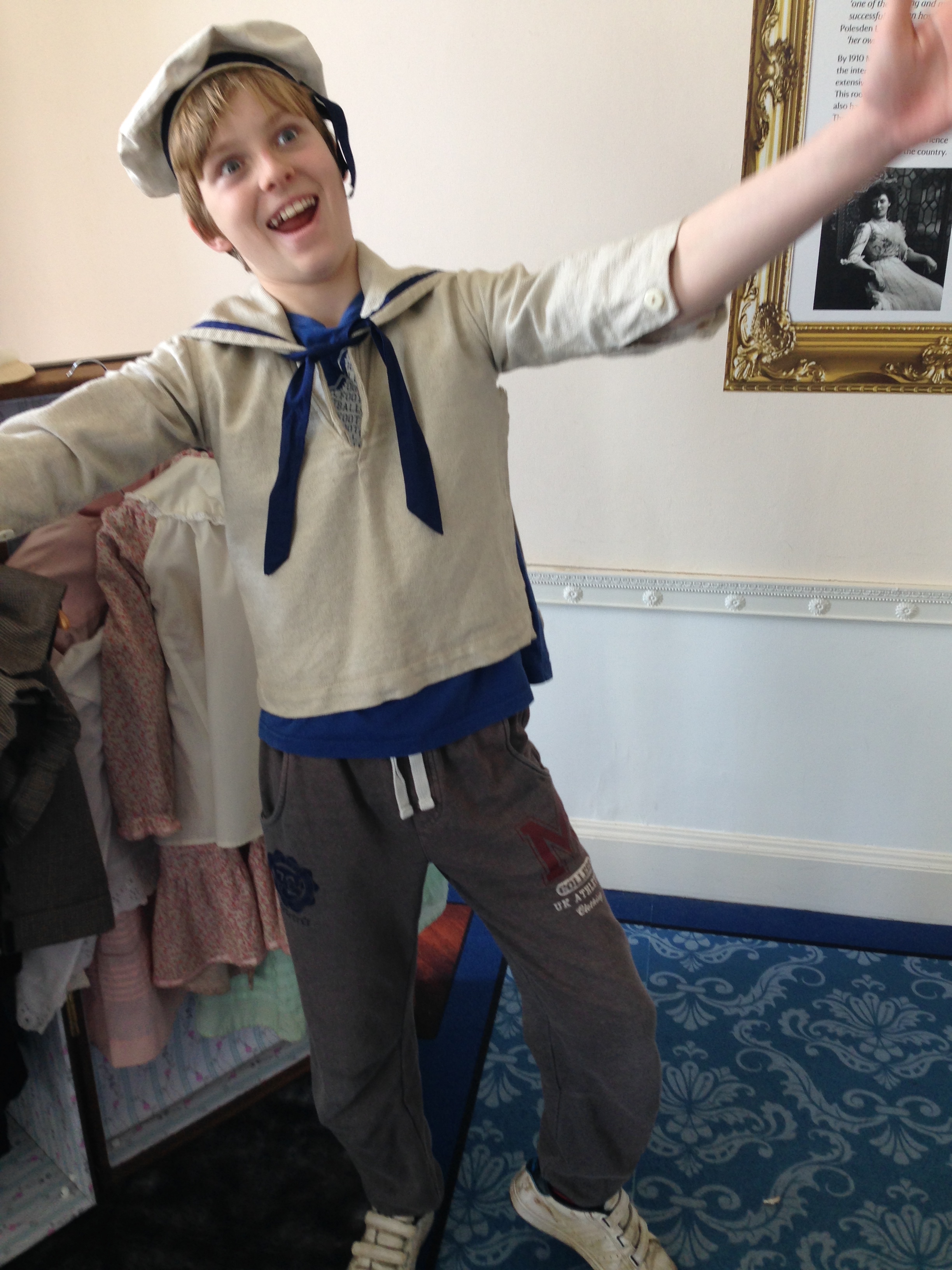 As it was such a beautiful day and so we decided that we’d got out for the day. Mark said he’d buy us all lunch as we’d worked so hard for the last couple of weeks. We didn’t want to drive too far, so opted for Polesden Lacey. We’ve all been here before, but Mark had never been in the house before. I think the last time he came with us it was February and the house was closed. So today he got to go inside. As we wandered through the rooms and looked at the wonderful views over the Surrey Hills, it made us all very jealous. We were dreaming of our ideal house and garden, and realised that what we would like we couldn’t afford. But still it’s good to dream. We all picked out what bedroom we’d like, which is a game we always play, George had a go at Billiards, and then found some dressing up clothes to try on. They were aimed for children a little younger, but George being George he wanted to have a go. First of all he dressed up as a poor boy with a cap and waistcoat on and then a sailor.