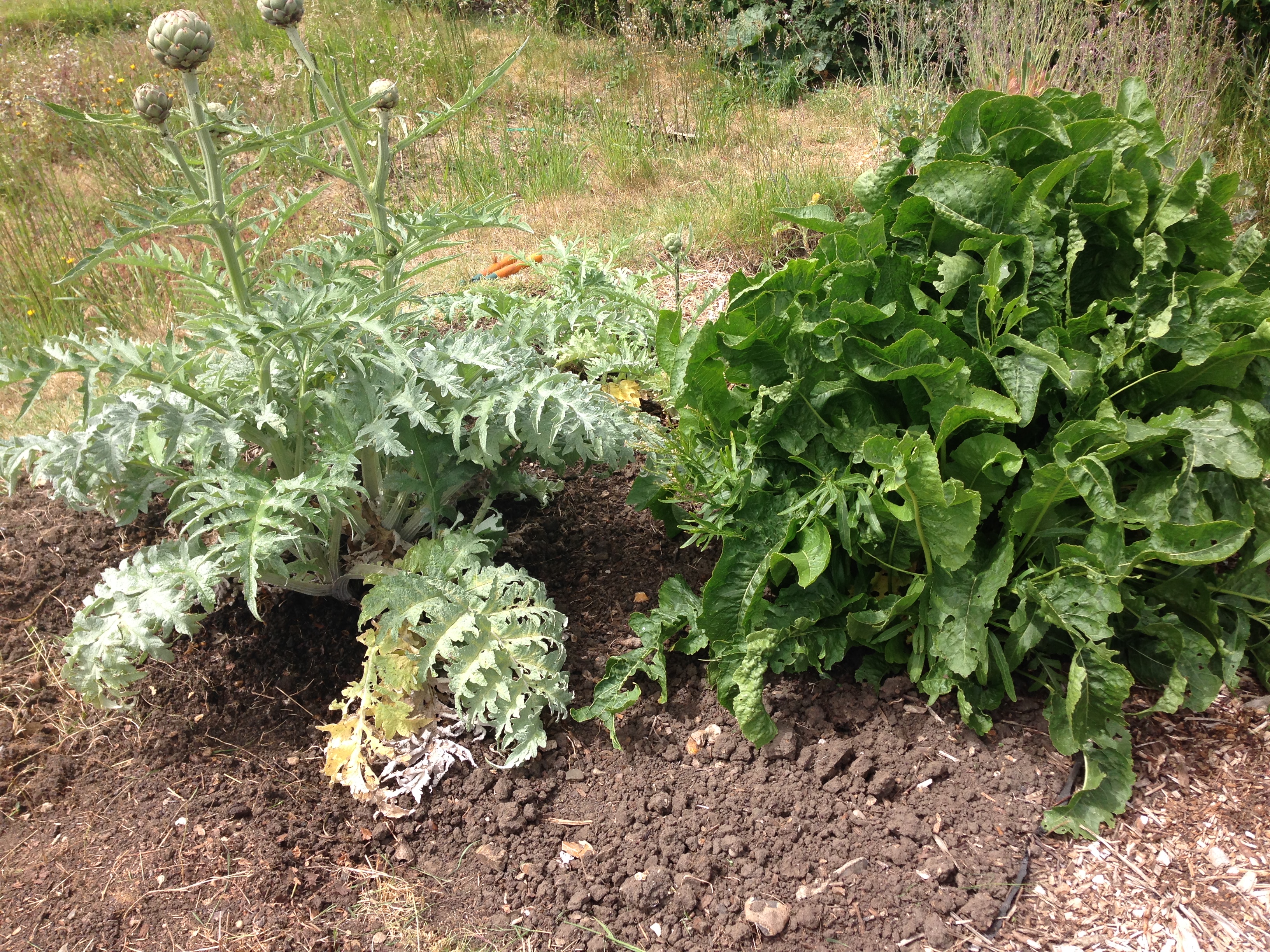 After my soup, bread and currant bun I was raring to go again, so it was onto the next bed which contains my Horseradish and Globe Artichokes. This only needed weeding and then a thorough water and feed. I can’t believe that the Horseradish plant has been in for about 5 years now and was so small when I got it in it’s 3 inch pot. Now it’s massive!! The Artichokes are growing well, but seem to have got a few black fly, so I’ll have to sort those out tomorrow.