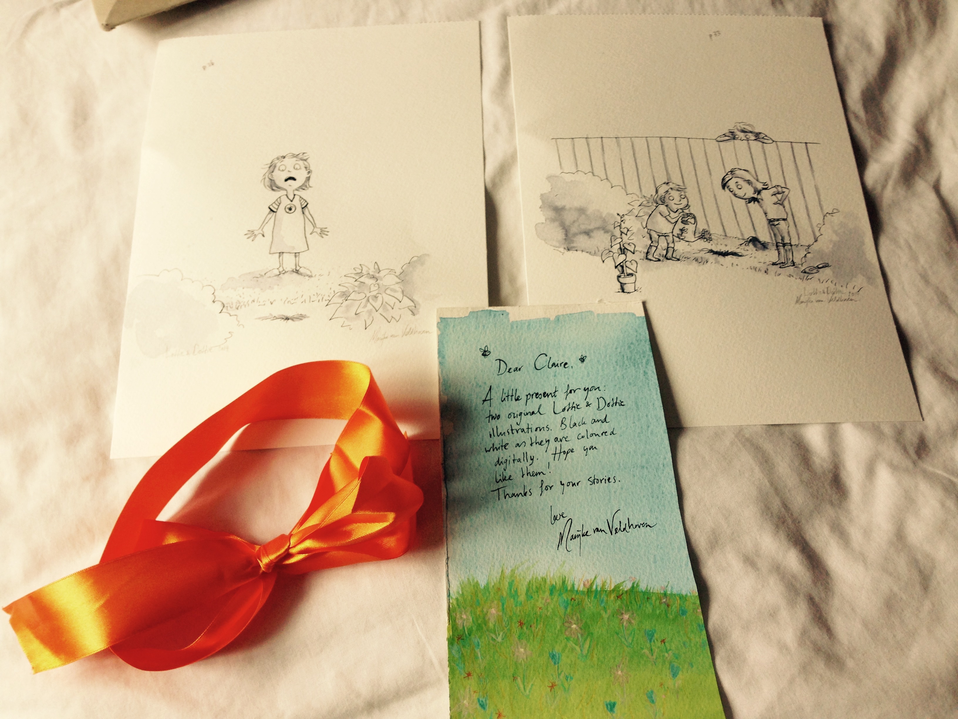 OMG look what I’ve just received through the post by my wonderful, fabulous illustrator Marijke Van Veldhoven…..Two original Lottie and Dottie pictures both from “Lottie and Dottie Sow Sunflowers”!!!
