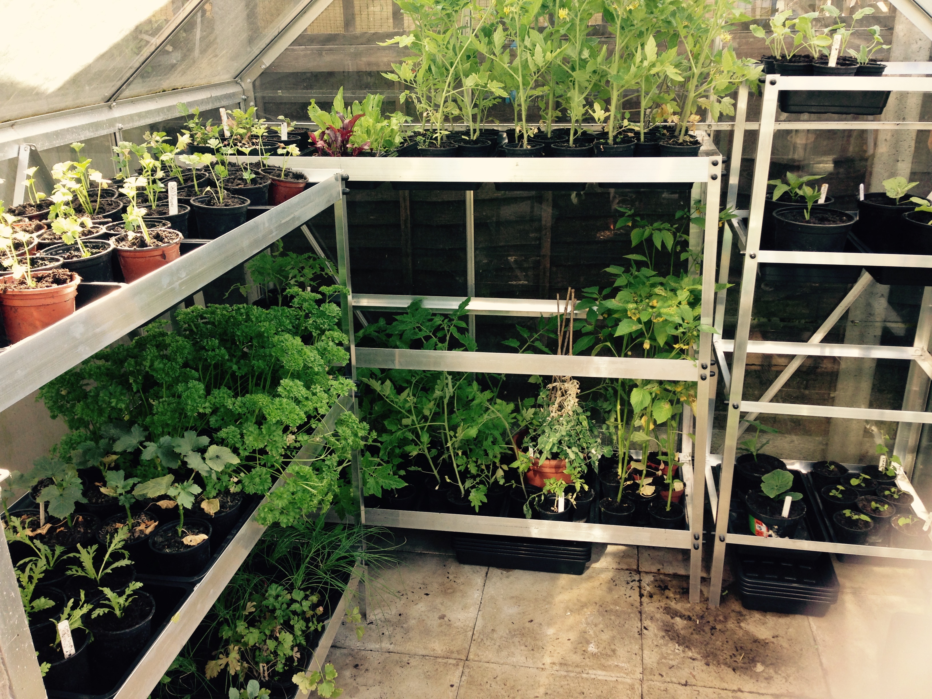 The weather was very “eh!” today, so not suitable for going to the allotment. It kept on raining, and I don’t really like getting THAT wet! So after lots of errands that I had to run this morning (all boring stuff that I’m not going to bore you with), this afternoon was free to dodge the showers and do stuff in the greenhouse. I started with making up 2 more of my staging packs. Now after making the first one, which did take a little while, the subsequent ones were much easer. After these were done, it was time to sort out some of the plants in the greenhouse, and pot them all on into various sized pots. So let me start at the beginning (which is always a good place to start). I potted up 2 Aubergine plants into 6 inch pots. These will stay in these for the rest of their growing life. Soon I’ll attached canes and they can grow up those. Hopefully I’ll get some fruit from these, they’re always a little awkward in the UK weather, but you never know. I then potted on 2 Sweet Peppers, again into 6 inch pots. I’ve only got 2 plants this year out of all the seeds I sowed. I usually do get some peppers, but they tend to be fairly small. But only time will tell. I then potted on 2 Spanish Cucumbers, again into 6 inch pots. If you grow these in a climate similar to Spain, then they can grow outside, but here in the UK they’ll have to stay in the greenhouse. The skins are thicker than our English Cucumbers, so I’ll have to take the skins off before we eat them. Then it was on to the Cucamelons which are in 3 inch pots. I saved one plant from last year. You can do this, as long as you store them in a frost free place. But I also sowed some new seeds, just in case. I now have 7 plants, so hopefully that’ll be enough Cucamelons to last us for a while anyway. When they get bigger they’ll go into 6 inch pots, but I’ll let you know when I do that.Hopefully it’ll be in about 3 weeks time. I then potted up the last of the Basil seedlings. These have been a bit slow to grow. I’m not sure why, but there you go. I didn’t expect them to be this tricky, but there’s obviously something they’re not happy about. I now how 5 plants in total. Hopefully now they’re in their new home they’ll grow well. Then it was the time to pot up the one and only Italian White Sunflower. All the others I potted up into 3 inch pots about 3-4 weeks ago, but the Italian White has been very slow. Still it’s now in a pot all on it’s own, and hopefully it’ll catch up with the others very soon. Then it was time to sort out the Celeriac. I did sow this a little later than I normally do this year, but it seems to have done very well. I picked out 36 plants for myself and put them in 3 inch pots, and then potted up 10 for my sister. The Celeriac did really well in the allotment last year, so hopefully it’ll do well again this year. I then potted up my Chop Suey Greens. Make sure that if you sow these, you don’t sow then too early. They can’t go out until all frost is gone in your area, so sow them about a month before your last frost date, otherwise they’ll get a flower on them before you plant them out and then they’ve gone too far. I potted up into 3 inch pots, 9 pots for me, with 2 plants in each pot and then a couple of plants for my sister. And finally (yes it’s the last one) I potted up some more Sprouting Broccoli. We go through this like no ones business in our household. I’ve potted it up in 3 inch pots, 9 plants for me and about 6 for my sister. What we don’t eat of this, the chickens will, the same goes for Cabbages. The greenhouse is looking good now. I’ve still got one more section of staging to make up for the greenhouse at home, and then it’s the 7 for the greenhouse in the allotment!!