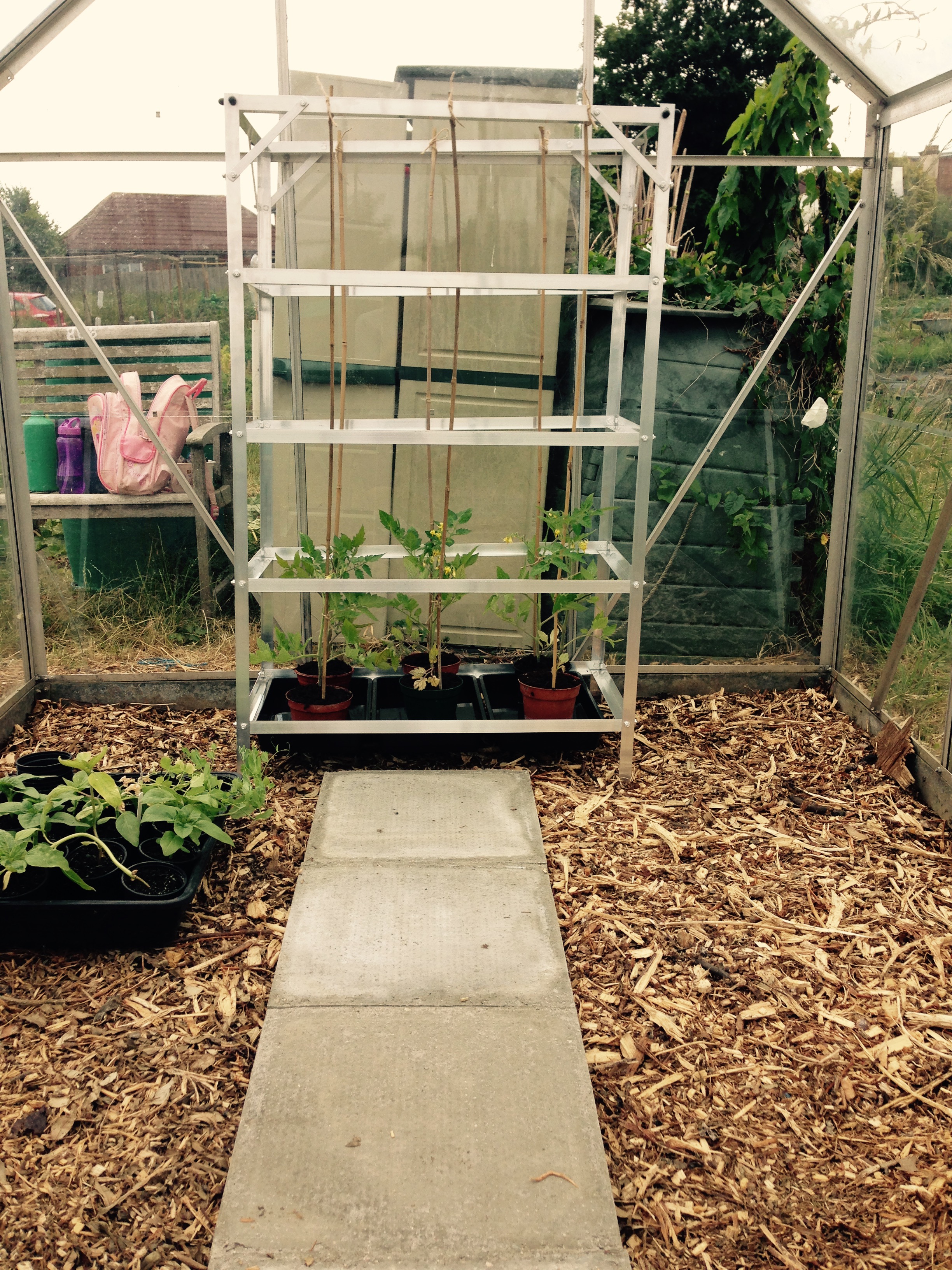 Well it is very hot and humid today. Carol Kirkwood said it would get up to 24 degrees today. But when I came home from the allotment just before 2pm it read 26 degrees!! Apparently next week is supposed to be hotter, but we’ll soon see if that’s true when we come to next week. It’s definitely time to get the shorts and vest tops out for the allotment, short leggings and a t shirt is too hot. Now on to Plot 1. I’m not going to show you a before shot, because I’m far too embarrassed about it, but I’ll show you the progression of each bed as and when I sort it out. It actually looks worse than it is. There is tall grass round most of it, and weeds that are actually fairly easy to remove, so I managed to get through more than I expected today. The first bed was the Rhubarb bed which wasn’t bad because I’d sorted that a couple of weeks ago. And the bed with Parsnips, Onions and Carrots in was ok. Once I’d weeded a bed, I then thoroughly watered and fed it. I then came onto the Strawberry bed, which is huge in itself. I harvested some strawberries, but I think this bed will be easier to sort out when the strawberries have finished, so I’ll just try and keep the weeds at bay for the time being. The strawberry runners from last year have ended up all over the paths, so I’m having to sort those out and am replanting them in tyres all around my plots. I’m getting 6 plants in each tyre, and any new runners I find this year, I’m cutting off. I think that having over 150 strawberry plants is enough for anyone don’t you? I then used my shears and cut the grass along a huge section of plot 1 and even this has made it look much better, but there is still a long way to go. Once I’d had my lunch I then put in the first of the new staging in my greenhouse and the first 6 Tomatoes in it. I’ll make another lot up later today and will take that down tomorrow. I can only fit one made up staging section in the car at a time, and the 6 tomato plants to go in it. So it’ll be a slow progress on getting them all down to the allotment, but never mind. It’s easier to make the staging up in my garden, as I can sit on the grass and am less likely to then get bitten on the bum by some red ants (they really like biting my knees though). Well that’s all for today. I’ll continue tomorrow and let you know what I accomplish. So until the TTFN!!