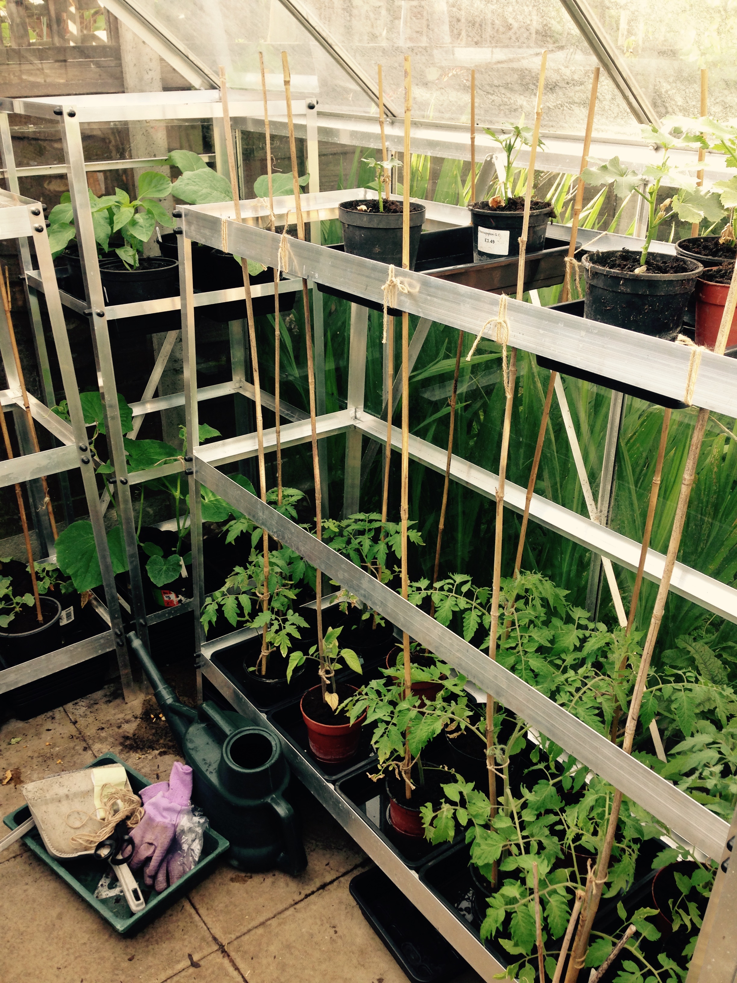 I spent the afternoon sorting all the plants in the greenhouse at home. It was a case of thinking, “Now that needs to go there, but I can’t do that until that’s done, but that needs to be moved first.” It was like a really complicated puzzle, but I finally figured it out. All the plants that are in the greenhouse at home are in their final positions and pots so all they need to do now is to grow. I’ve got a few more plants to go in the greenhouse on the allotment, but I’ll move those down on Tuesday afternoon as I’m working all day Monday and Tuesday morning. It’s a good feeling when it’s nearly all done. So here are some pictures of what I have and where they are in my greenhouse at home.