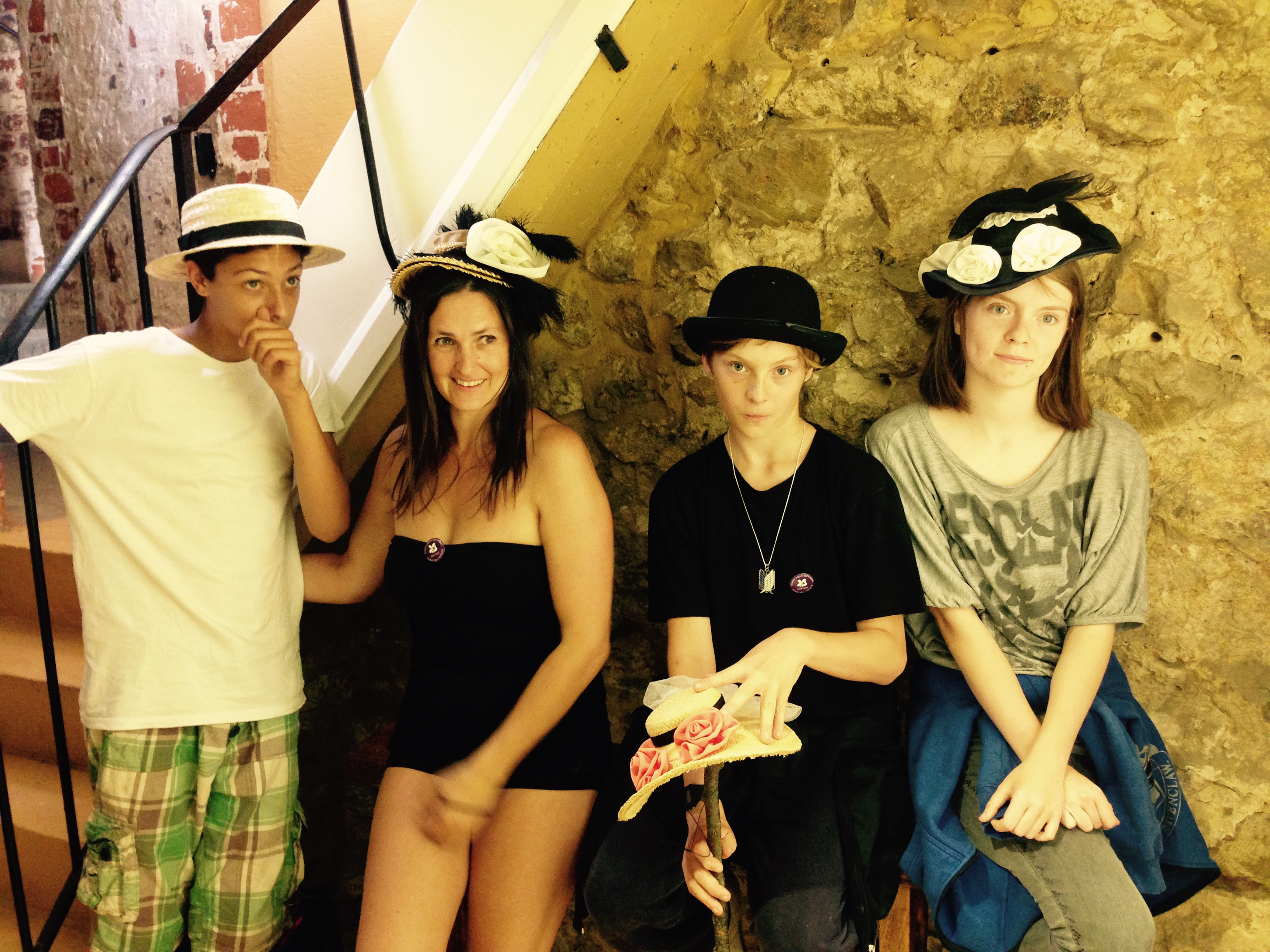 After lunch we climbed the tower and were able to get to the very top. It’s celebrating it’s 250th year (if I look this good after 250 years I’ll be very happy) and they were giving out free badges to commemorate this. Half way up the tower there was a room where you could try on some hats, and look like people back in the olden days. Of course we had to give them a go.