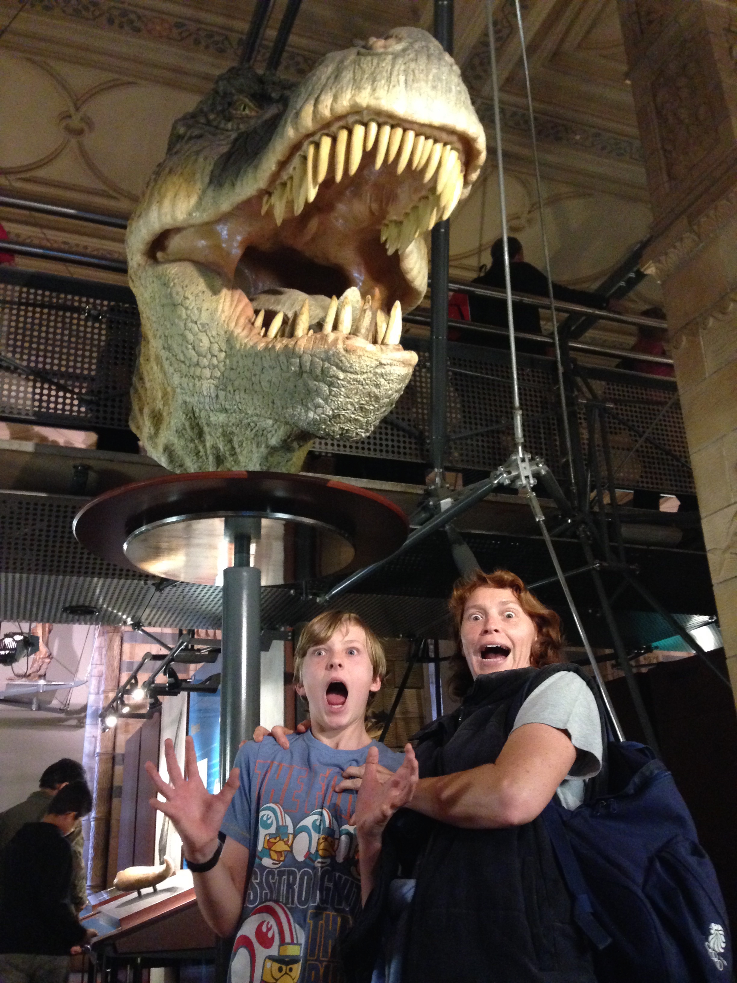 A bit of sad news the ant colony is no more. Apparently the Queen ant died, so the rest of the colony then fails and the ants die. They’re waiting for another Queen to arrive soon. It’s the first time we’ve ever seen them like that. We then went to view the Mammals. They’re in the process of moving the Blue Whale so there’s a lot of scaffolding around it at the moment. We saw the Elephants, Polar Bears, Hippos and all the rest. The once that was done (and we’d had another little sit down) we then queued up to see the dinosaurs. Again the queue was epic, but it moved surprisingly quickly. We again played the “Alphabet Game”, but this time we had to name dinosaurs. I’m pleased to report that I did incredibly well, even George was impressed. So he should have been, I’m a cool mum!! The moving T Rex is amazing, and very loud. As we were waiting to see it, a little boy in front of us asked his dad “Are they real dinosaurs?” The innocents of the young!! A very lovely man took our picture underneath the T Rex head which was very kind of him.