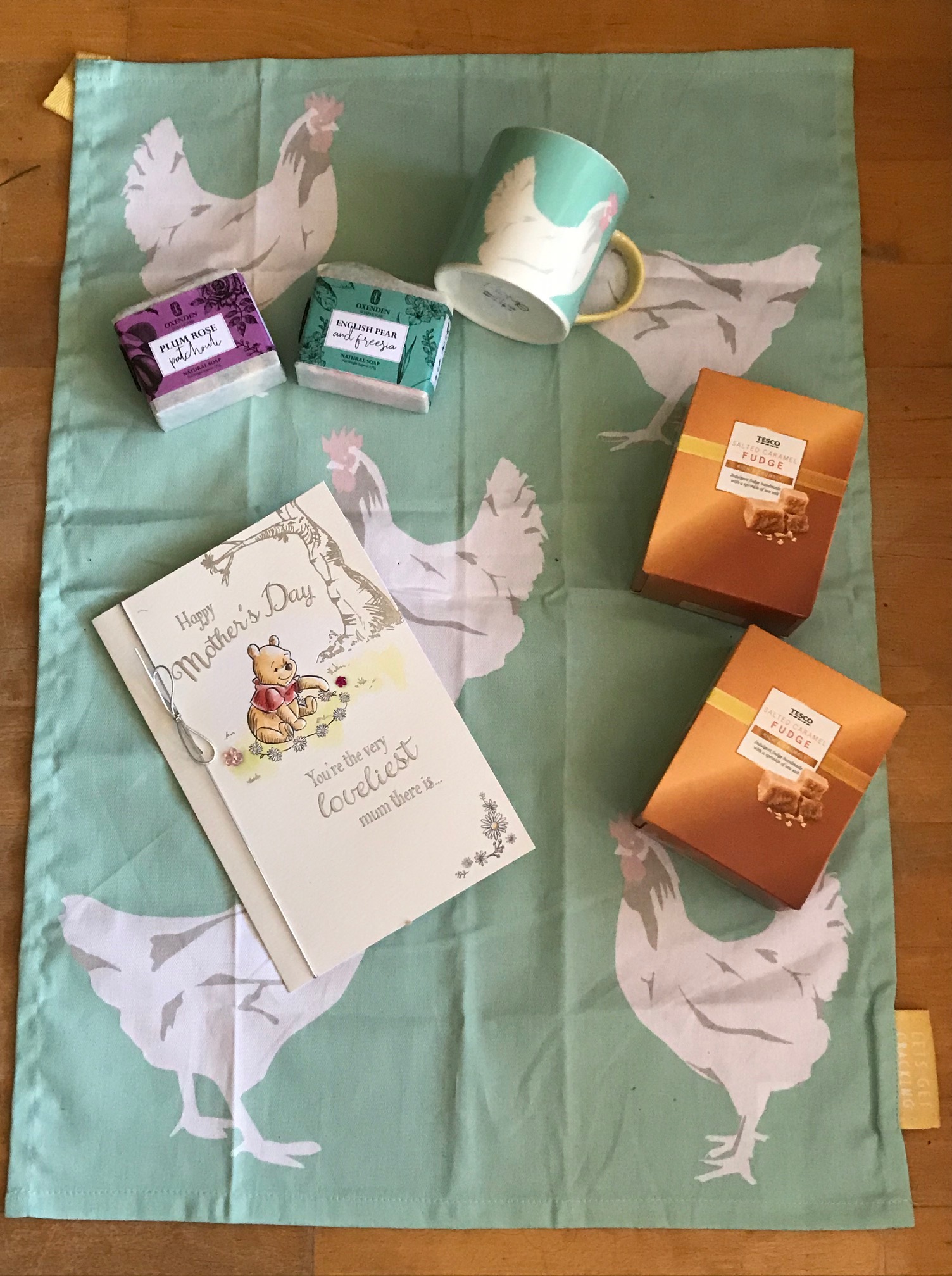 Today was Mother’s day and I got some wonderful gifts from Emily, George and Kai. No beer or wine, but then my birthday is in a week, so I’ll keep my fingers crossed I get some then. Still I had plenty in the fridge so that was fine. The kids clearly know me very well, as they got me a lovely chicken tea towel and mug, as well as come lovely fudge (not the smooth kind but the stuff that melts in your mouth which I prefer), and a couple of posh bars of soap so I can try and get my hands clean after a day in the garden.