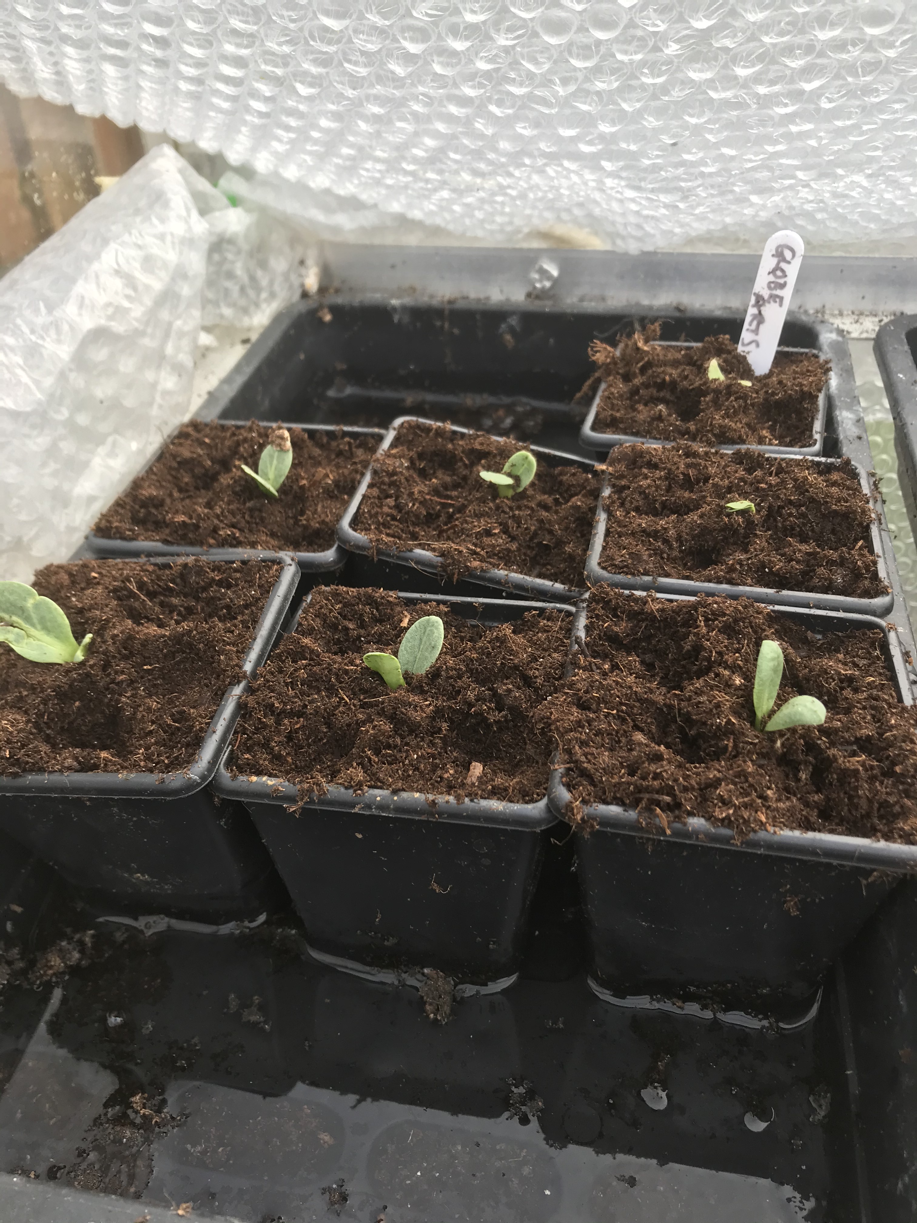 The melons took a while to germinate, but the little blast of warmth we had last week helped them on their way and they soon popped their heads through the compost. Bless them.