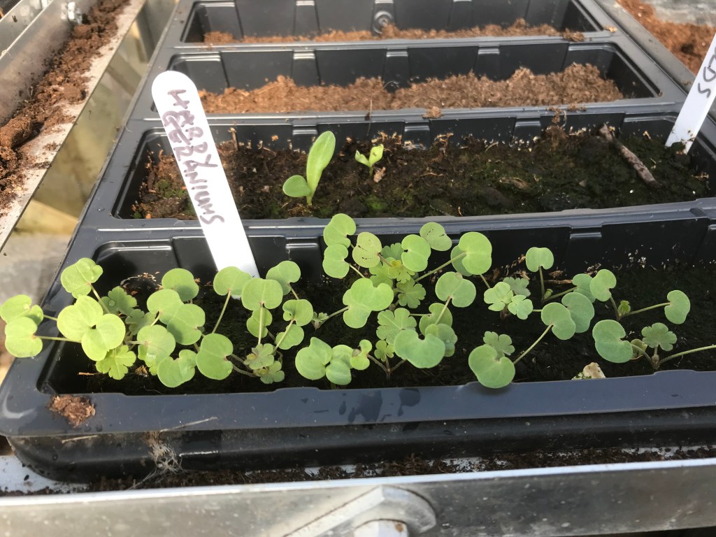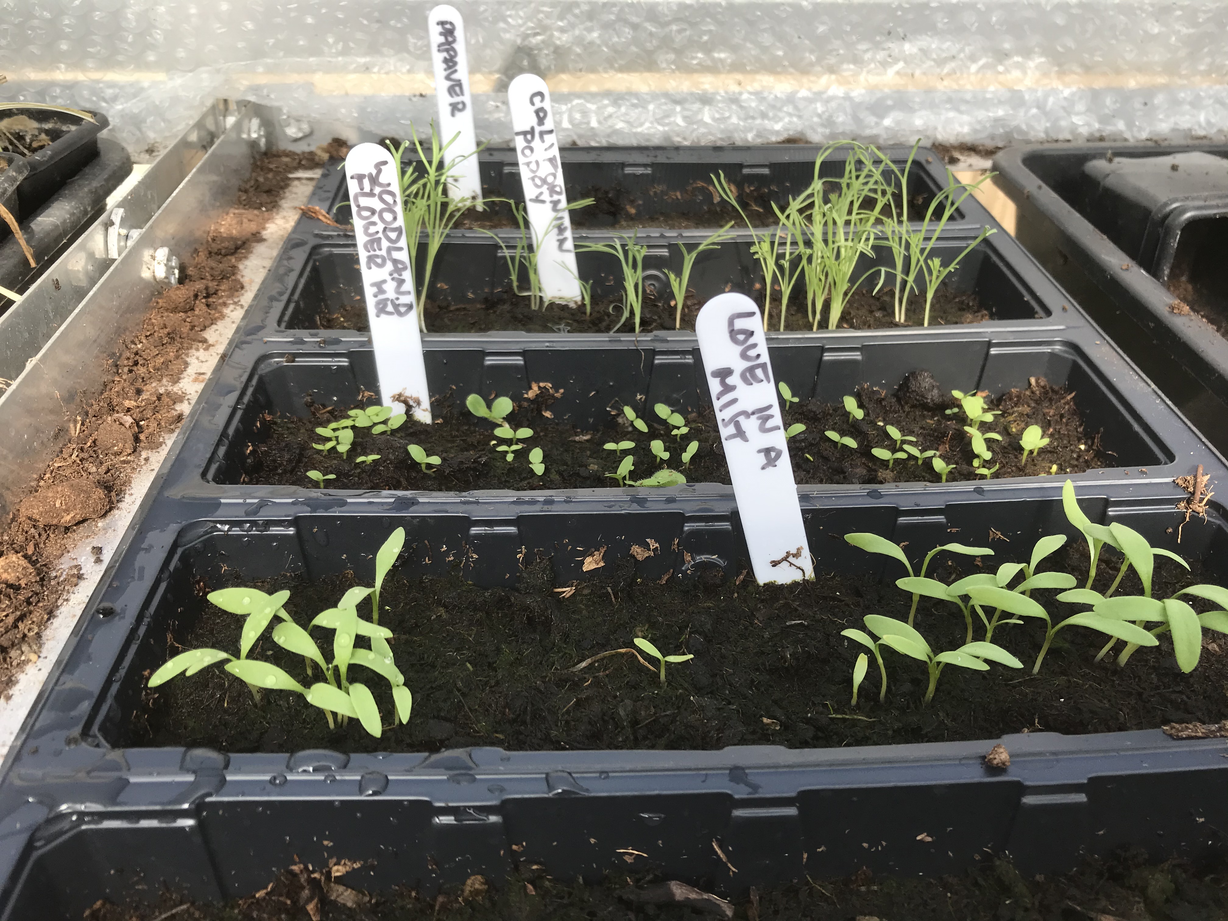 The brassicas have been growing really well and are now large enough to be pricked out and go in individual pots. They’re about an inch and a half tall and some are just about getting their first set of true leaves. It didn’t take too long as I made sure that I only sowed a few of each this year. It’s very easy to sow too many. You really have to restrain yourself when sowing seeds.