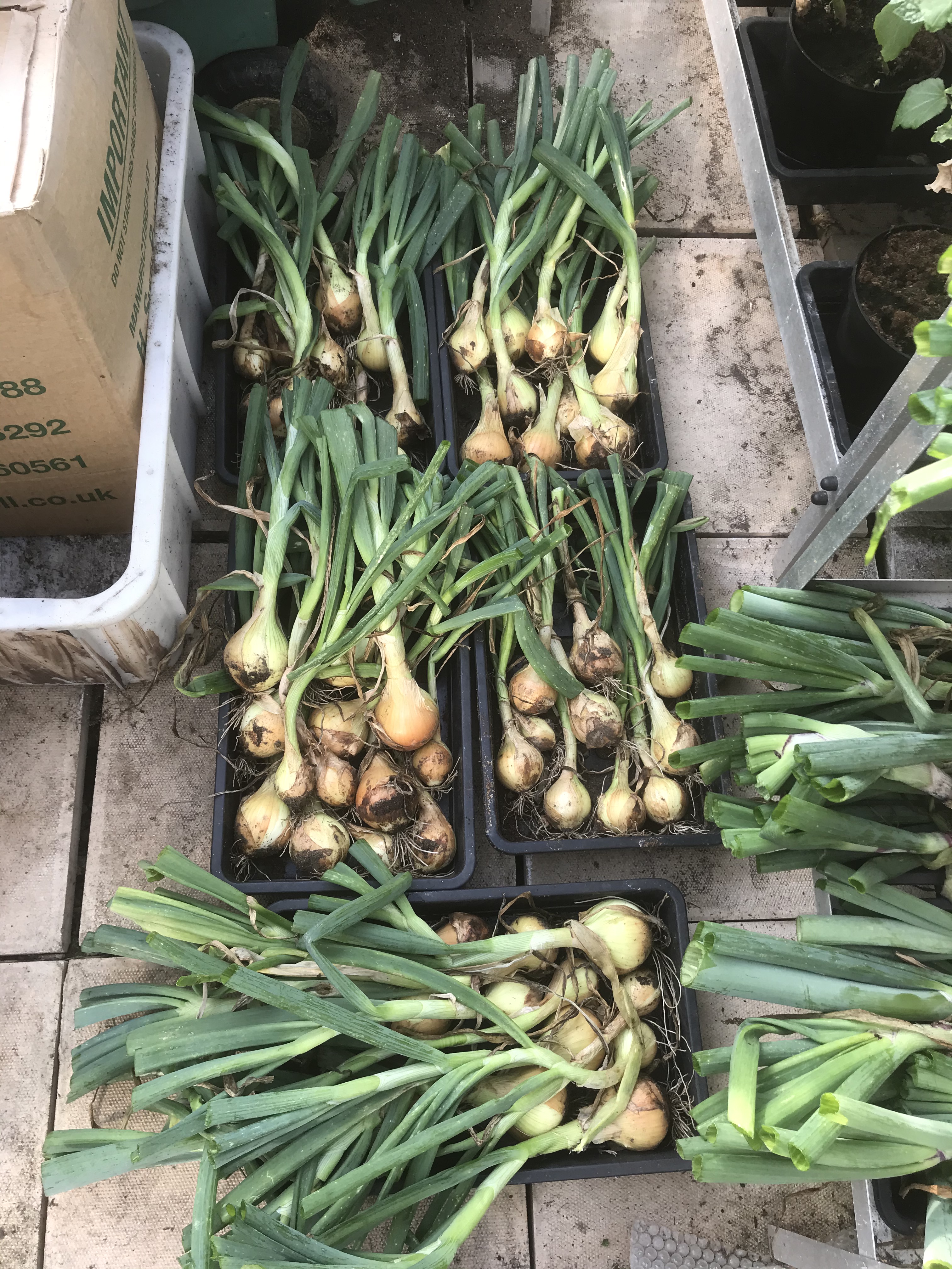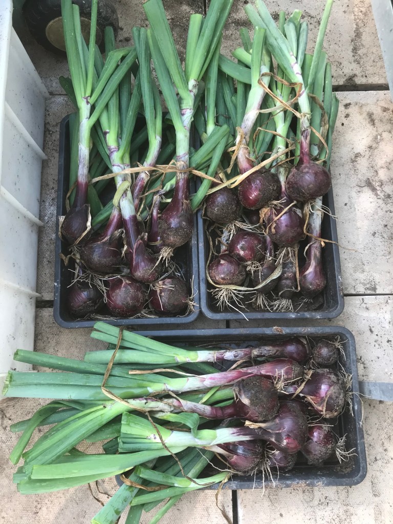 And finally I’ve started harvesting some of my Onions. I sowed some from sets (little baby onions) and some from seeds. The ones from the sets are now ready. You know when your onions are ready to harvest because the stems fall over. You can leave them in the ground until the stems start to go brown, but once the stems have toppled then the onions won’t do any more growing.