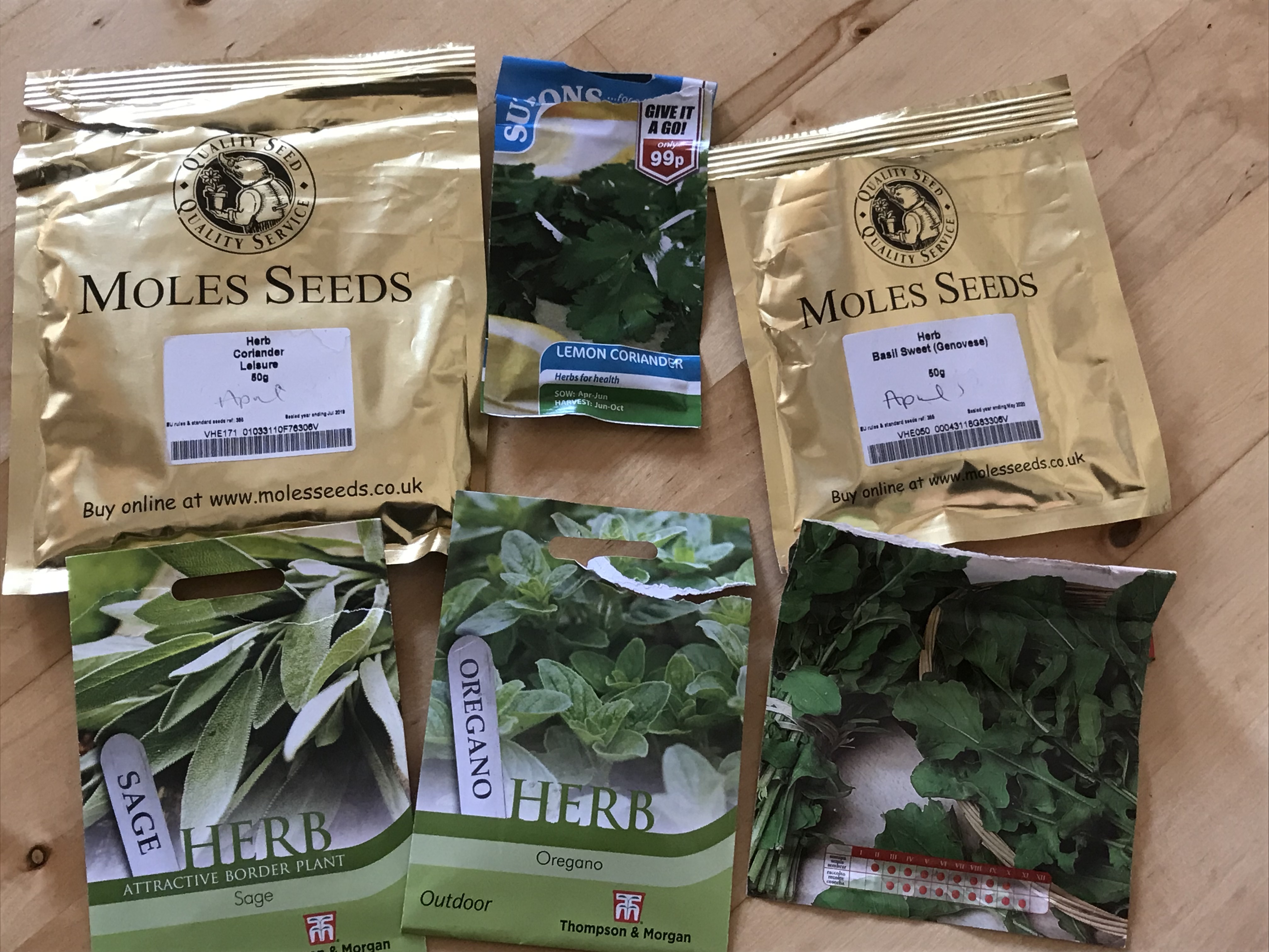 I’ll start with the herbs first, all of these need to be sown on moist compost and then sprinkle a little more compost on top of the seeds. A couple of different varieties of Coriander “Lemon” and “Leisure” (but they don’t seem to do this variety anymore or have renamed it). Basil “Genovese” you can beat it it’s amazing. There are loads of other different varieties of Basil so just sow them all the same way. Oregano, Sage and then I’m going to put Rocket in with this lot as well. The variety I have is from Spain, so have given you a link to one that looks the same that you can buy in the UK.