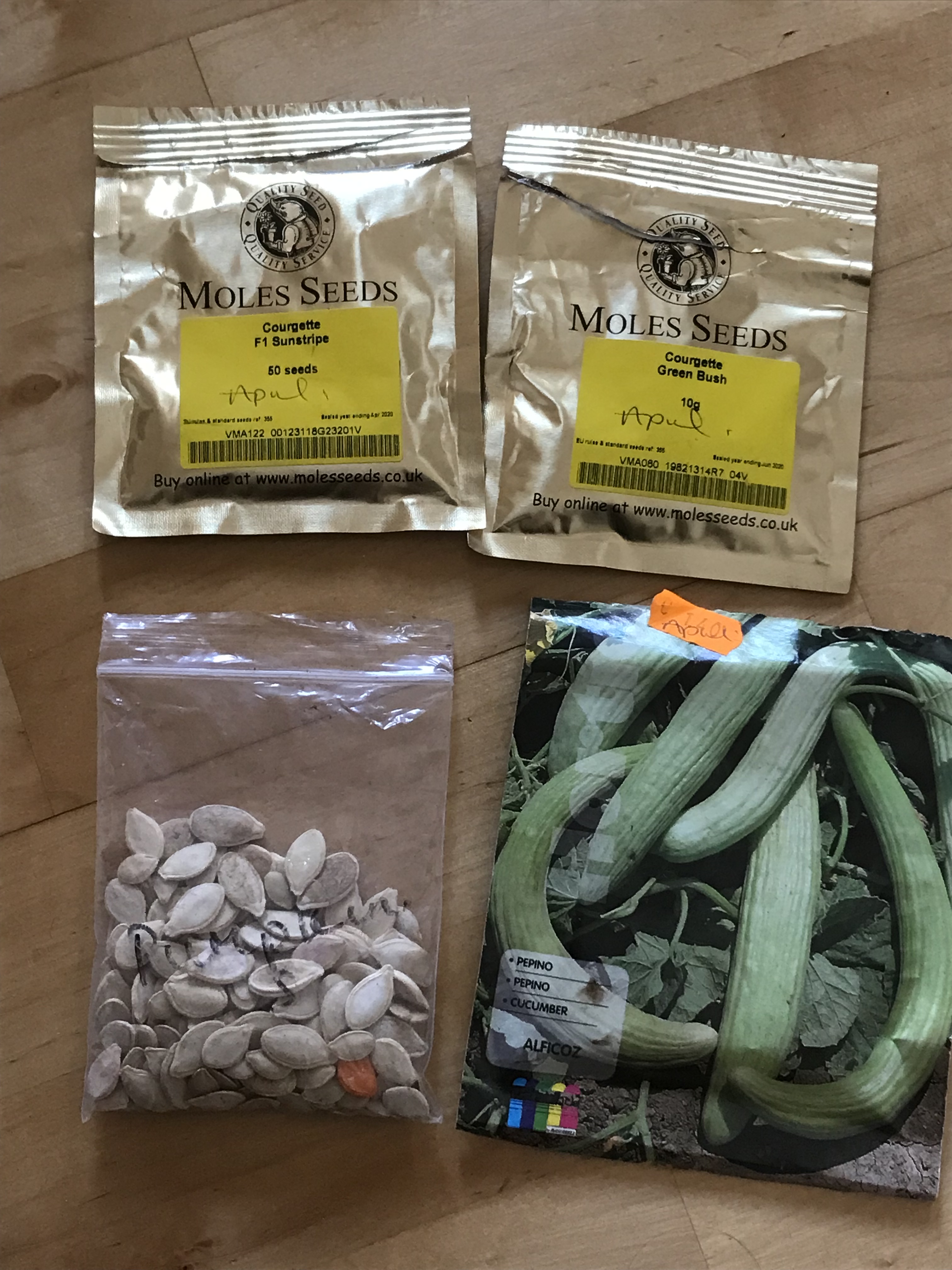 Next I’ll move on to the Cucurbits. Now these I have not sown in seed trays but in individual pots. I’ve sown 2 seeds per pot and at diagonal corners. If both seeds come up I won’t separate them as they will grow very happily together. Because these seeds are large they’ll need to be sown sideways and not flat. If you sow them flat then the water will sit on the seed and may rot them. The Cucurbits I have are two different varieties of Courgette “Green Bush” and Sunstripe”, just remember courgettes are prolific so you only need a couple of plants. A variety of Cucumber called “Alficoz” which again I bought from Spain, They are also sometimes called Snake Melons. I would have given you a link to a company abroad that you can get the seeds from, but due to the debacle of BREXIT these companies will no longer ship to us (Claire makes and angry face). So the only suggestion I can put forth is if you know someone who is either going on holiday or who lives in Spain, maybe they can bring you a packet of seeds home. I’m sure that’s still allowed. The company I got mine from in Spain, or you could try Franchi Seeds, you may find some garden centres stock these. Good luck xx