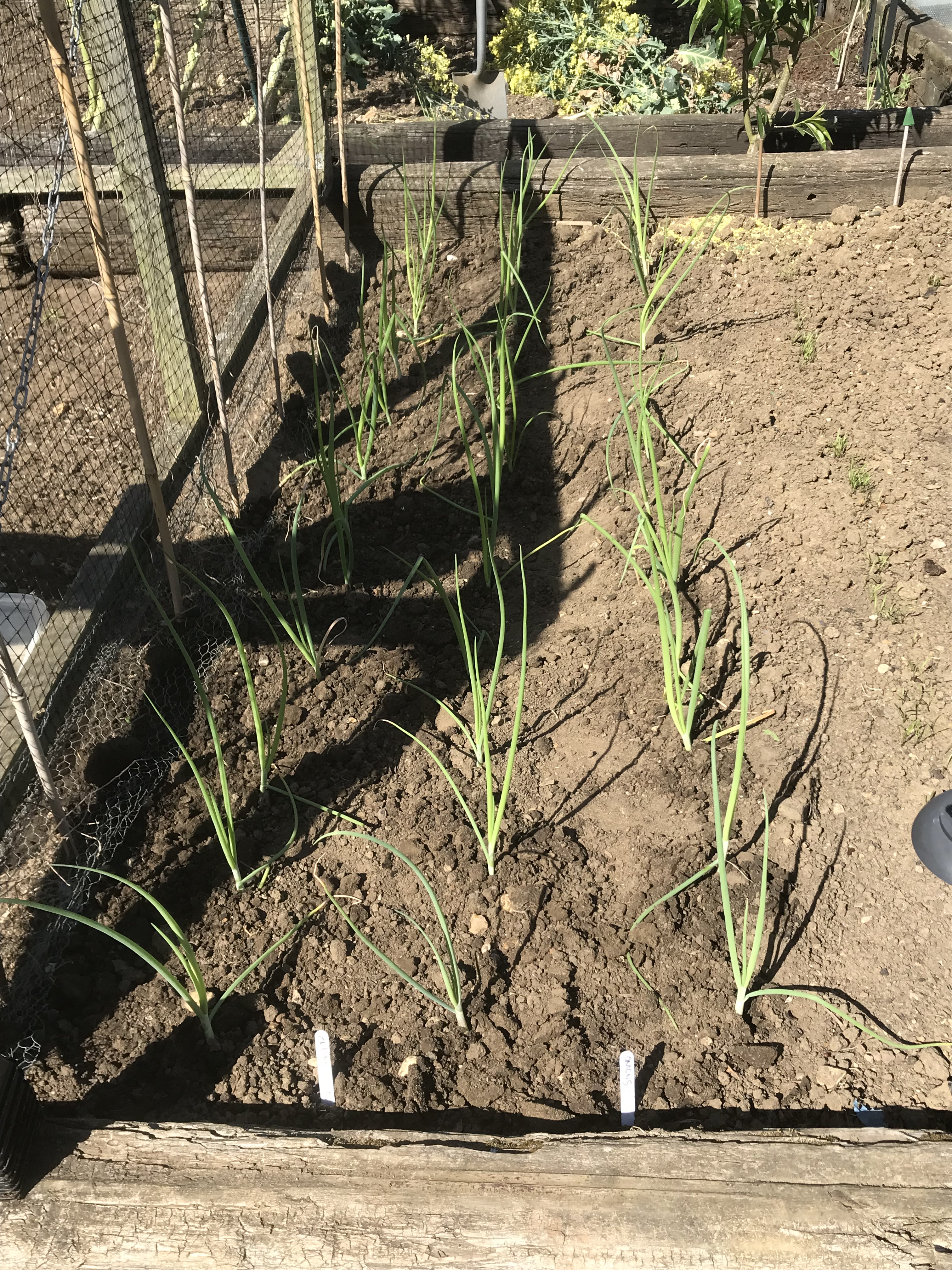 In the remainder of the brassica cage where the chickens were playing I have a little bit of space left, so that’s where this years onions are going. I sowed them from seed in late January, pricked them out in early March and now they’re ready for the big outdoors. I plant them about 6 inches apart, so they have enough room for the bulbs to swell. Once they were in I watered them in well.