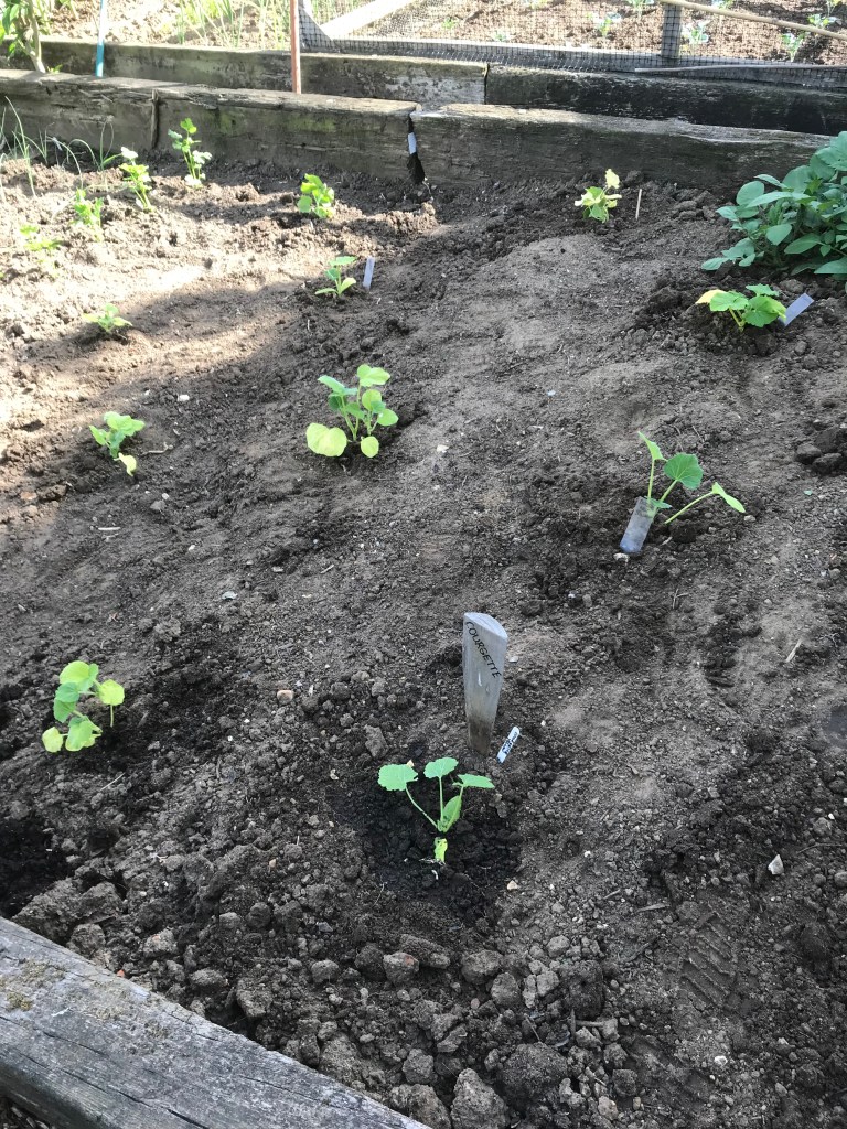 The last bit of space in the back bed is for the Sweetcorn and the cucurbits (courgettes, pumpkins and butternut). This year the first lot of Sweetcorn didn’t germinate so I sowed some more a week ago. One has only just started to pop through the soil. If no more has arrived next weekend, then I’ll sow some more. Doesn’t matter if the sweetcorn goes in a little later as I can just fit it in amongst the cucurbits.