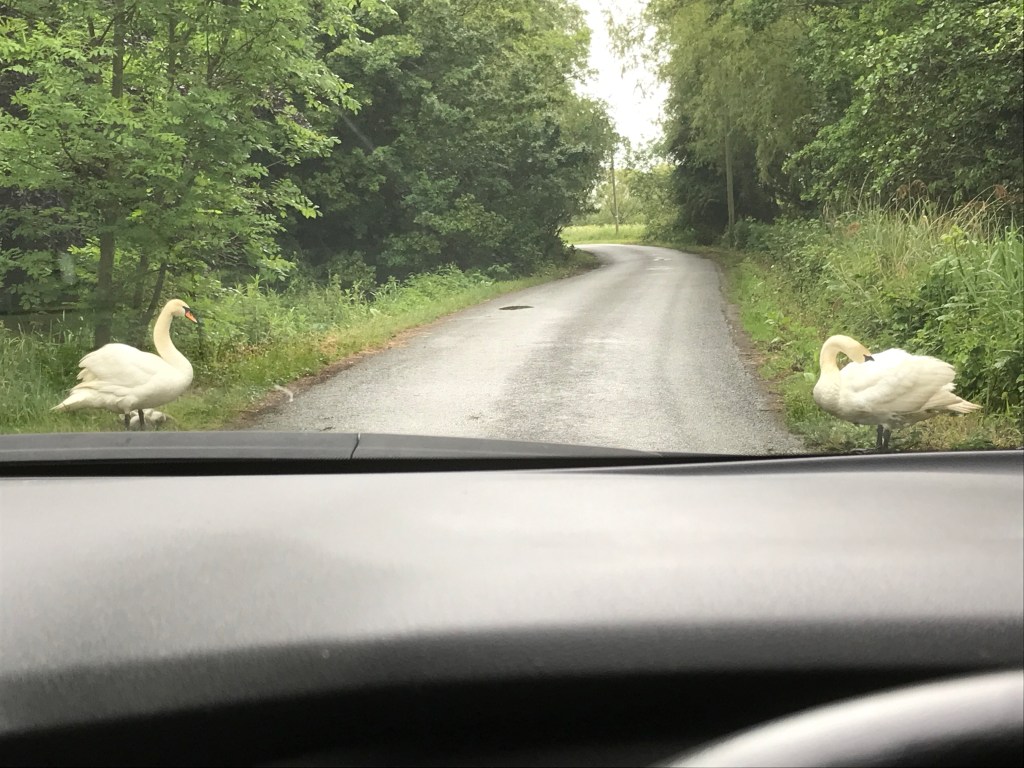 But we do have wildlife all around from bunnies hopping around the back field and round the front and scooting across the road in front of the car, peacocks calling to each other, sheep and lambs in the field down the road, rhea’s grumbling as you walk past and a myriad of different birds flitting about, some small, some medium and some marsh harriers and the occasional owl and bats. The local swans in the stream are now teaching their babies about the Green Cross Code. Us locals drive sensibly, it’s the out of villagers that drive like idiots. Drive past them really, really slowly and carefully.